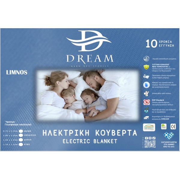 Οι Ηλεκτρικές Κουβέρτες DREAM κατασκευάζονται στην Ελλάδα από το 1972 στο υπερσύγχρονο εργοστάσιο της εταιρίας στη Λήμνο. Είναι εγκεκριμένες και πιστοποιημένες διεθνώς (British Electrotechnical Approvals Board -B.E.A.B. Αγγλίας-, EMF, CE, ROHS κλπ) πως πληρούν τις πιο πρόσφατες και τελειότερες προδιαγραφές. Όλα τα υλικά τους είναι ελληνικά, εκτός των αντιστάσεων που κατασκευάζονται σε εξειδικευμένο εργοστάσιο της Αγγλίας για την απομόνωση των ηλεκτρομαγνητικών πεδίων. Κάθε ηλεκτρική κουβέρτα DREAM, μετά τη σχολαστική και επιμελημένη εργασία κατασκευής της, ελέγχεται και ακτινοσκοπείται σε ειδικά υπερσύγχρονα ηλεκτρονικά μηχανήματα που εγγυώνται και διασφαλίζουν την ασφαλή και απροβλημάτιστη λειτουργία της σε βάθος χρόνου. Ολα αυτά σας υπόσχονται ένα ζεστό και ξεκούραστο ύπνο με όνειρα γλυκά! Η Ηλεκτρική Κουβέρτα DREAM είναι απαραίτητη για μικρούς και μεγάλους. Αφαιρεί την υγρασία από το στρώμα και εξουδετερώνει τους μικροοργανισμούς. Ανακουφίζει από τους πόνους αρθριτικών, ρευματικών, ισχιαλγίες, ενοχλήσεις περιόδου.